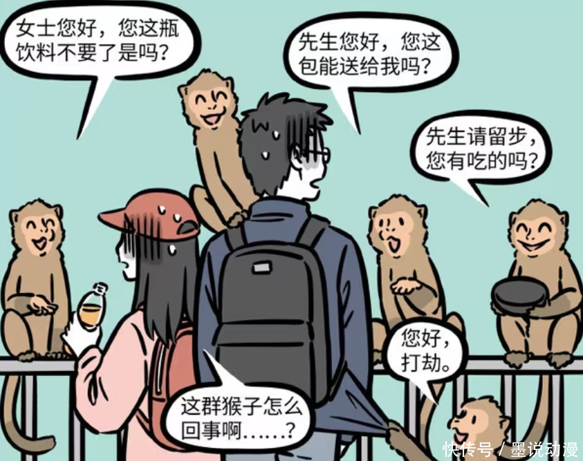 从变化上来说,这些花果山的山公如实不同样,变得很有规律。规律地讨要饮料,还让搭客送它们包。致使还用先生名称男性搭客,便是问吃的齐很客气。不外还有只山公,更是规律性的劫掠。看来那只山公仅仅改动了花果山山公的格调,并莫得改动骨子。这群山公是用所谓的“时髦”的形态万博体育(中国)官方网站,去拿念念要的东西。