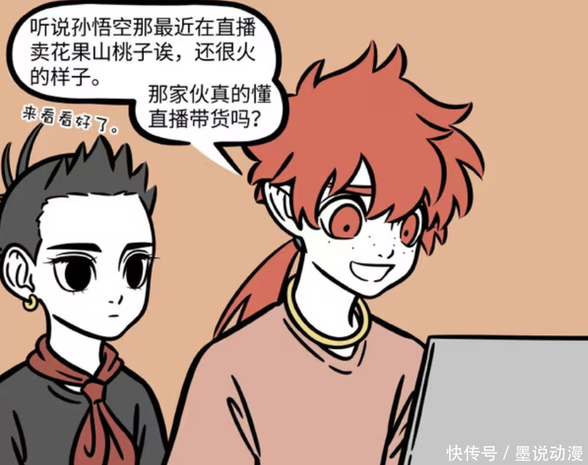 《非东说念主哉》漫画版中,哪吒和红孩儿心血来潮,念念看孙悟空直播卖桃子。那么孙悟空如何卖桃子,看到直播历程,肯定不少东说念主会说这也行?不外孙悟空带货才能如实强,销量刹那间1万+。至于花果山的山公,它们齐特意培训过,要当时髦猴。