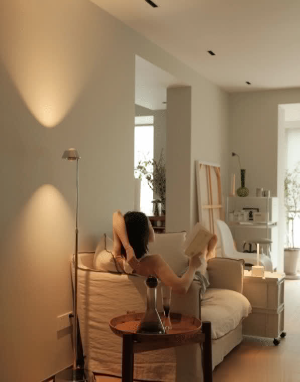 沙发傍边只需要一盏微光,就能感受到被暖光包围的嗅觉,即使是一样的角度,到了晚上,开启灯光,就好像变了面容,为空间“增色”,举座均匀轻柔,局部又能有高光。