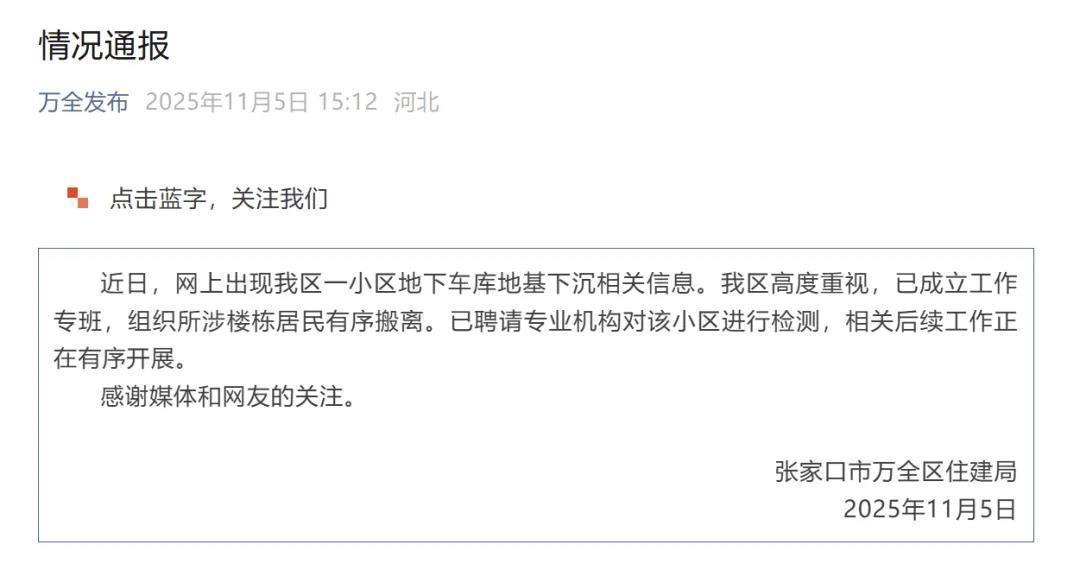 11月5日,张家口市万全区住建局发布《情况通报》称:“近日,网上出现我区一小区地下车库地基下千里相关信息。我区高度喜欢,已配置职责专班,组织所涉楼栋住户有序搬离。已遴聘专科机构对该小区进行检测,相关后续职责正在有序开展。”