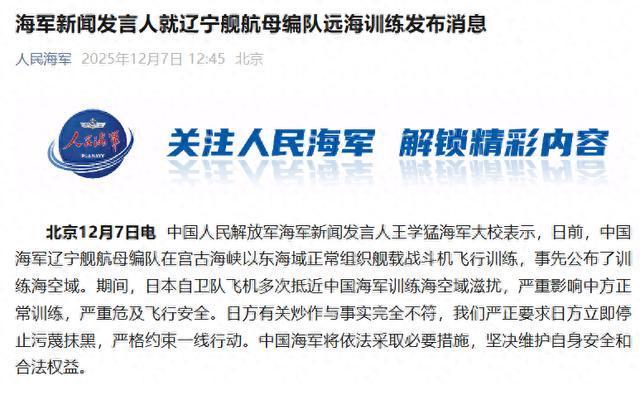 长沙晚报掌上长沙12月7日讯 据新华社音尘 中国东谈主民开脱军舟师新闻发言东谈主王学猛舟师大校示意,日前,中国舟师辽宁舰航母编队在宫古海峡以东海域频频组织舰载战役机漂泊锻练,预先公布了锻练海空域。时辰,日本自保队飞机屡次抵近中国舟师锻练海空域干扰,严重影响中机动常锻练,严重危及漂泊安全。日方接洽炒作与事实十足不符欧洲杯体育,咱们严正条目日方立即住手诬蔑抹黑,严格不停一线算作。中国舟师将照章采用必要格局,坚定珍贵本人安全和正当权柄。