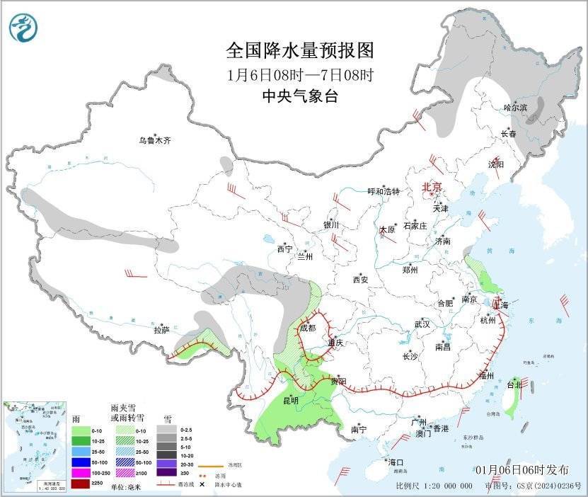 1月6日08时至7日08时,新疆阿勒泰和西南部山区、青海南部、西藏东南部、四川盆地西部、云南东北部、东北地区大部、内蒙古东部等地的部分地区有小到中雪或雨夹雪;云南东南部、贵州西部、江西西北部、江苏东南部、台湾岛东部等地的部分地区有小雨。西藏北部、甘肃西部、内蒙古中部、山西中部、辽东半岛、山东半岛等地的部分地区有4~6级风,阵风7~9级;南海西南部海域将有7~8级、阵风9级的东北风,渤海、渤海海峡、东海大部海域将有5~7级、阵风8级的偏北风。